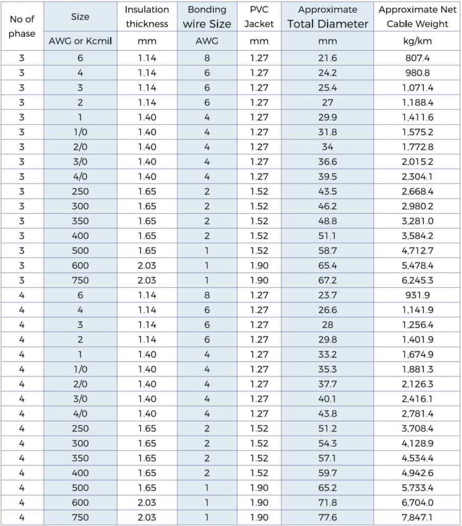 - Conductor: Three or four compact 8000 Series ACM aluminum conductors with bare aluminum bonding wire in multi-conductor cables