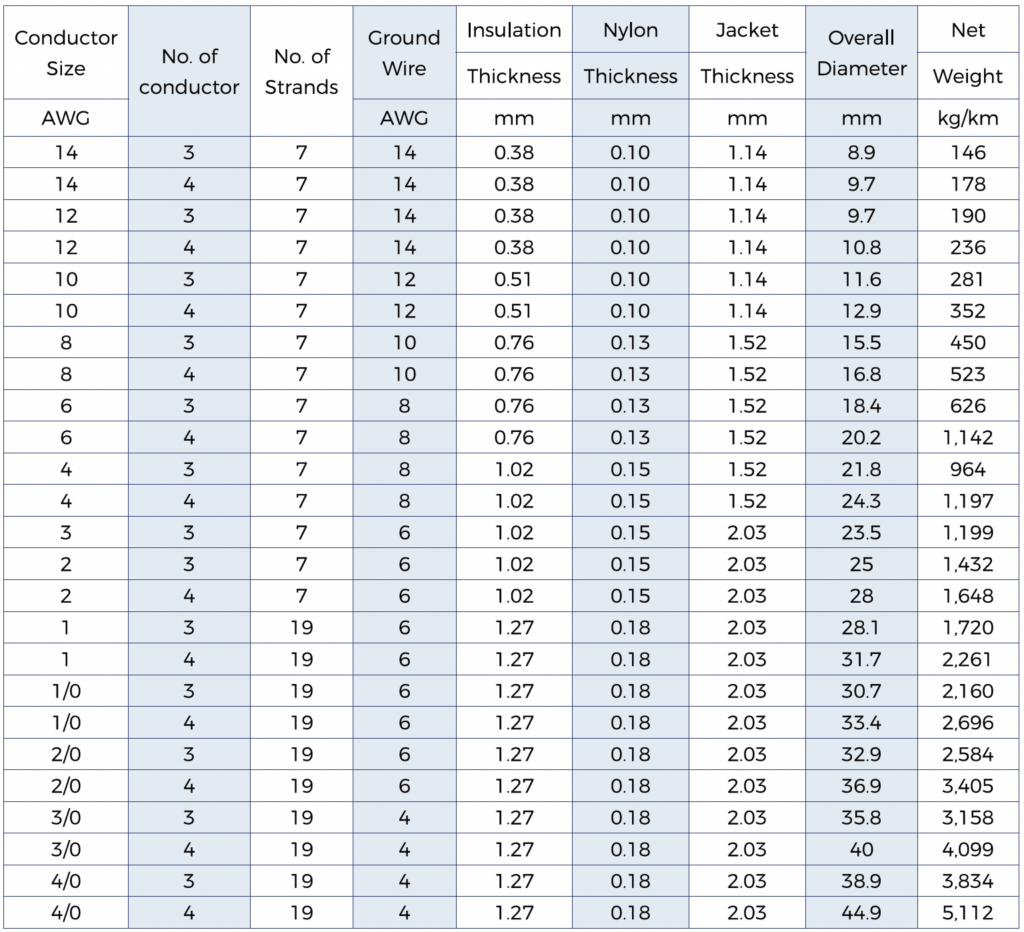 - Conductor: Stranded annealed bare copper. Ground Conductor(Optional): One (1) bare stranded copper conductor